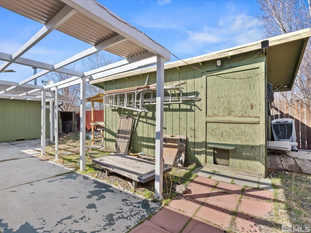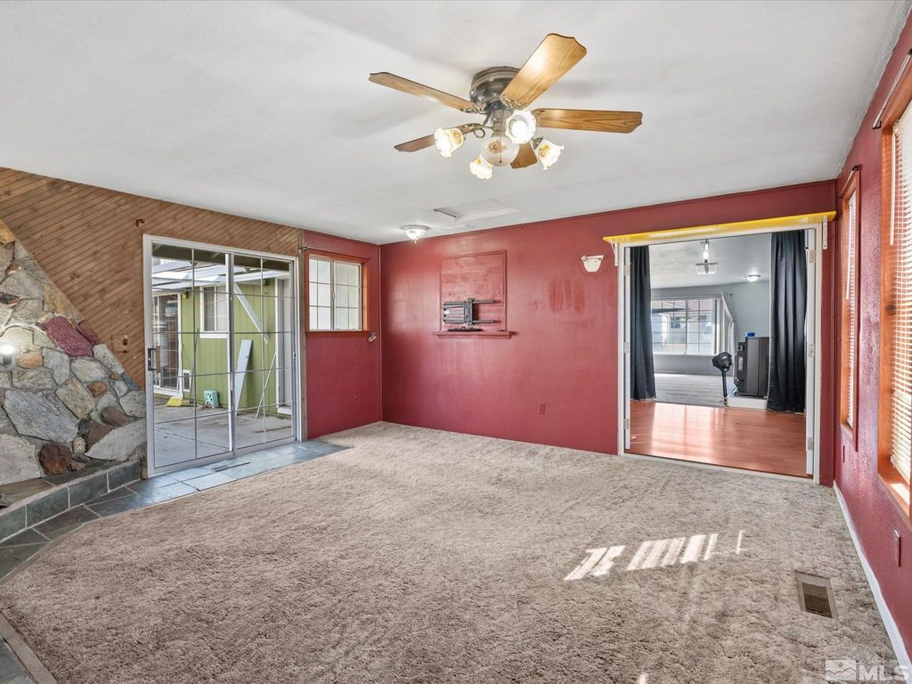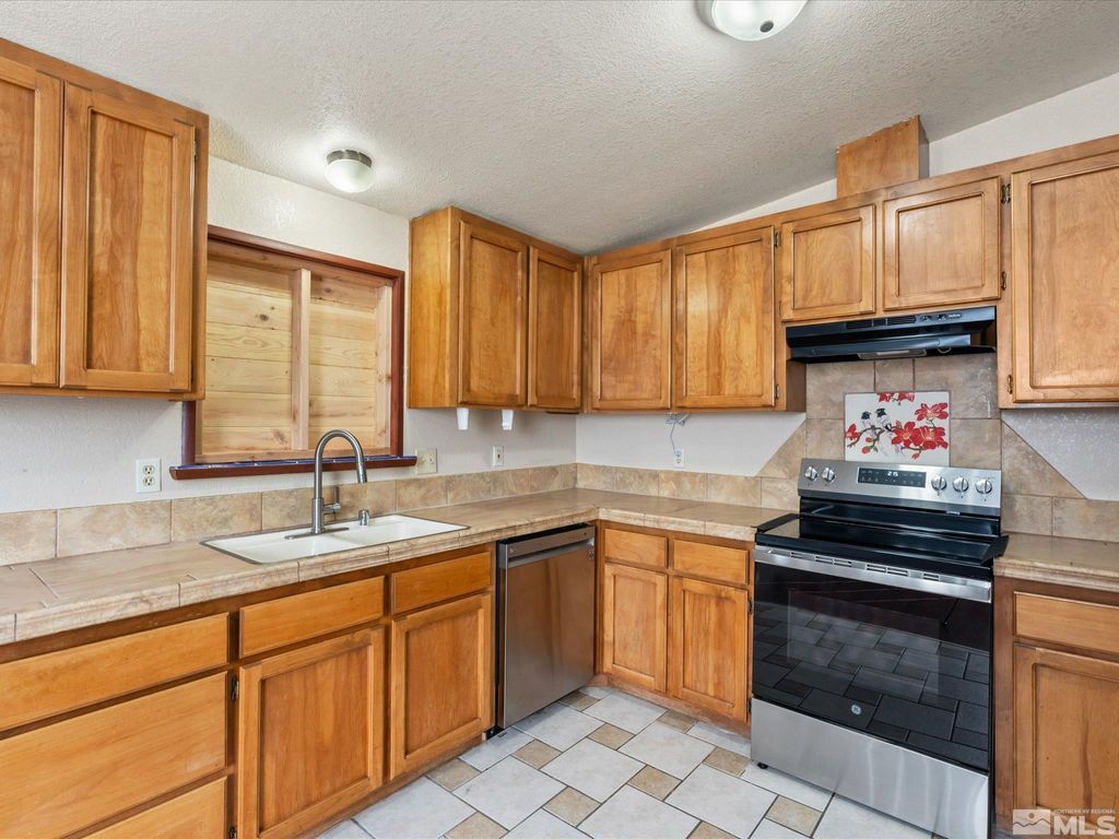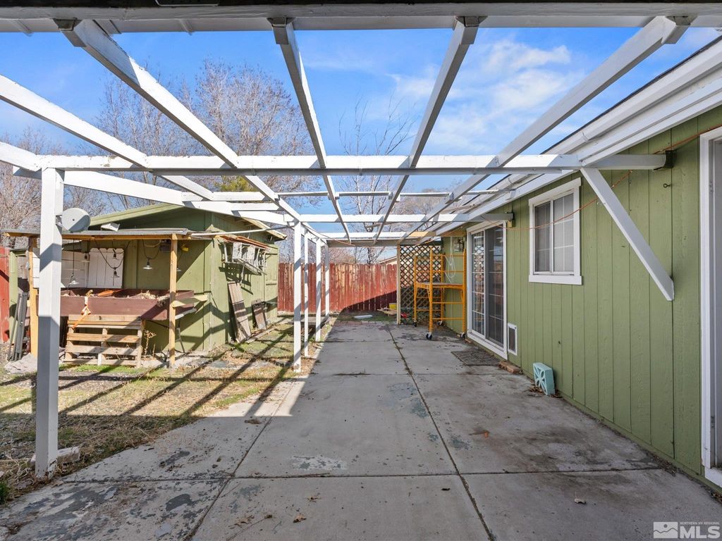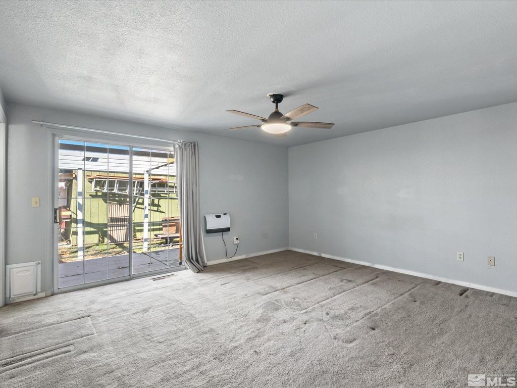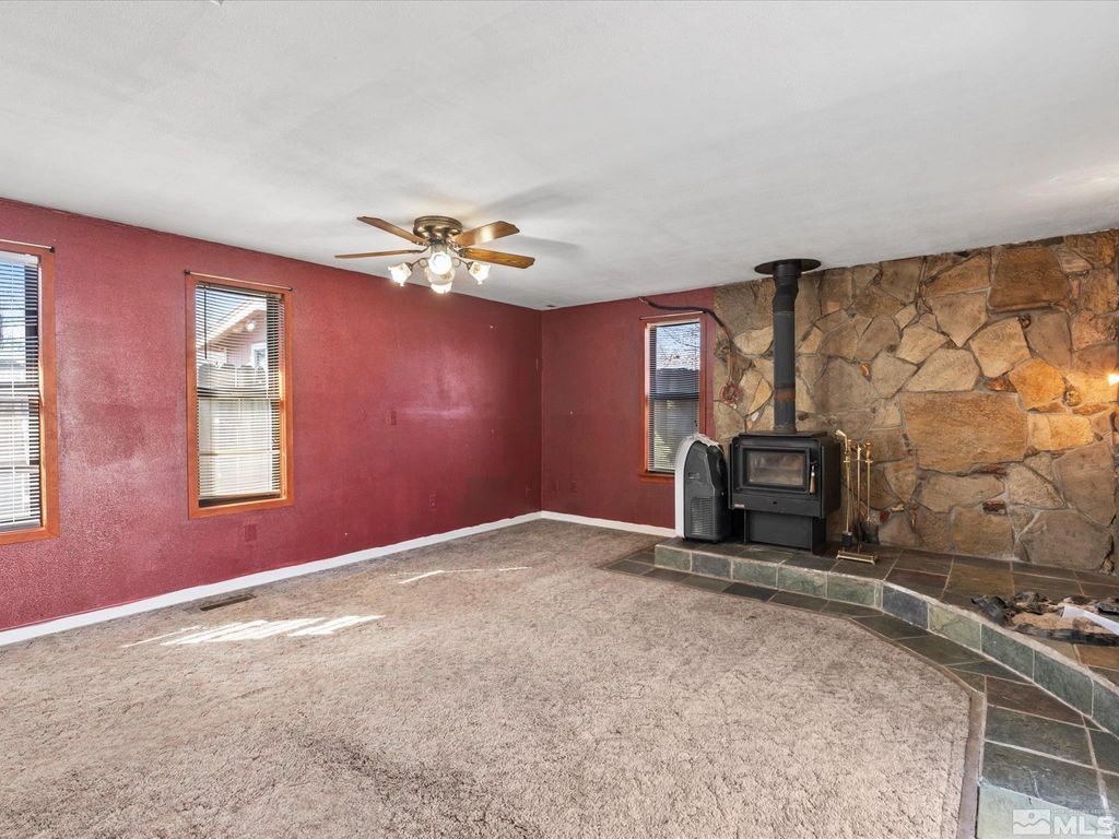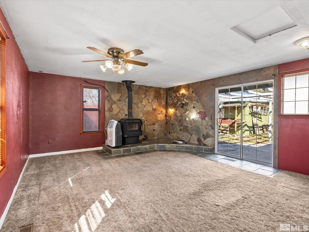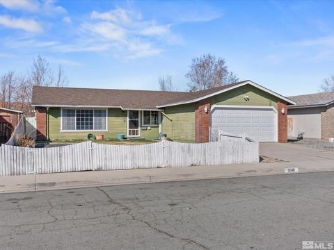 Welcome to this charming single-family home built in 1992. This residence offers three bedrooms and two bathrooms, spanning 1,720 square feet of living space. The home features a spacious living room with high ceilings, a tiled kitchen, and an additional 280-square-foot bonus area, perfect for a family room, office, or den. This extra space includes a wood-burning stove on a slate hearth and a sliding door leading to the backyard. The kitchen offers brand new appliances such as refrigerator, dishwasher, and stove, all purchased within the last 2 years! The primary bedroom boasts backyard access, a walk-in shower, and dual vanity sinks. The backyard includes a storage shed and a partially covered patio, providing ample outdoor space for relaxation and entertaining. Located in a quiet neighborhood, this property combines comfort and convenience, making it an excellent choice for homeowners seeking space for relaxation and entertaining. Located in a quiet neighborhood, this property combines comfort and convenience, making it an excellent choice for homeowners seeking space and functionality in Carson City.