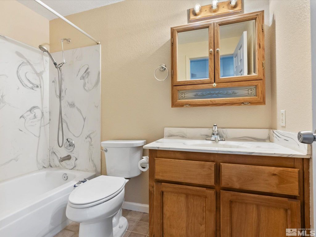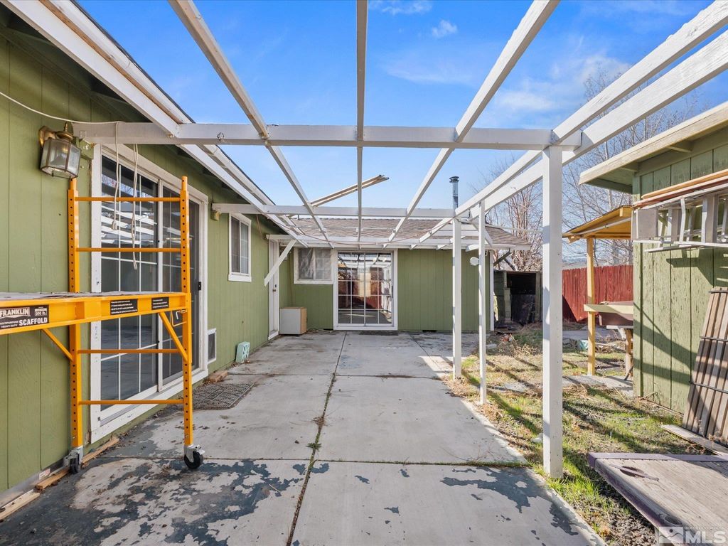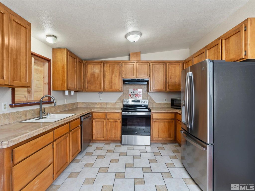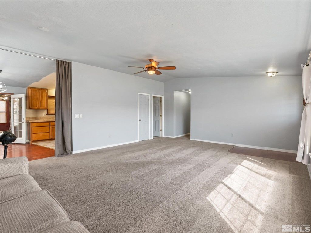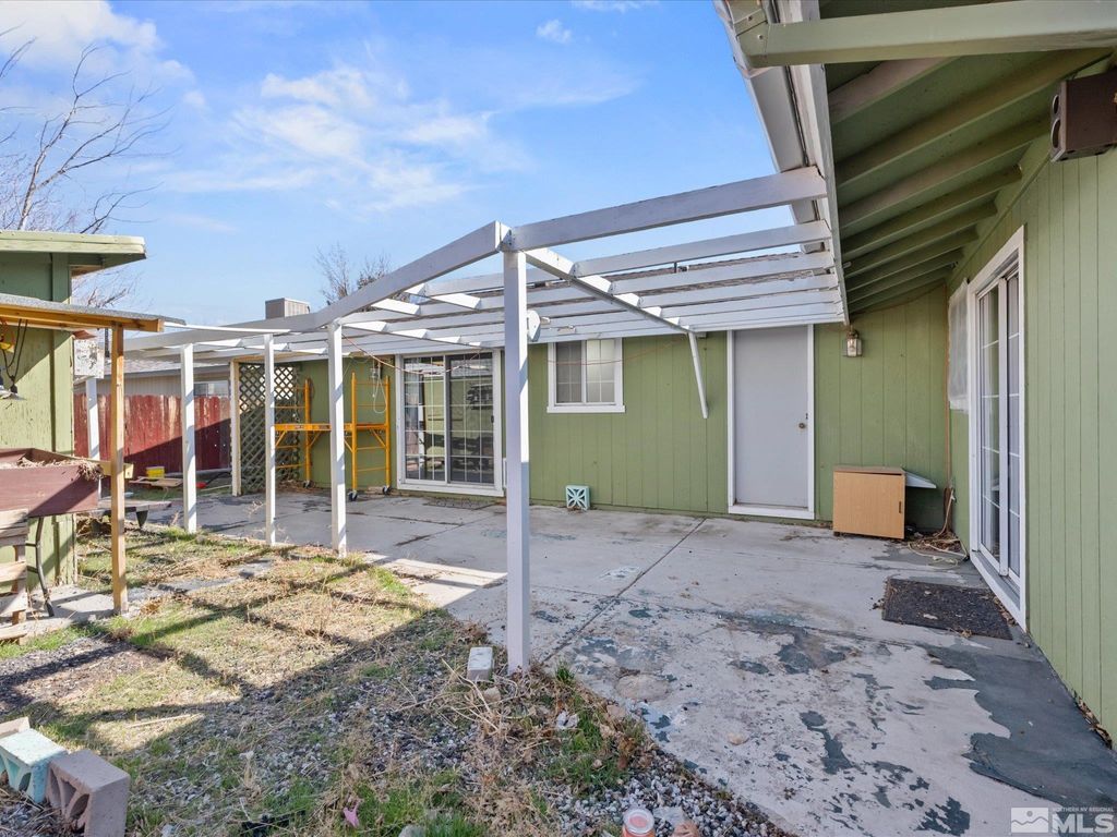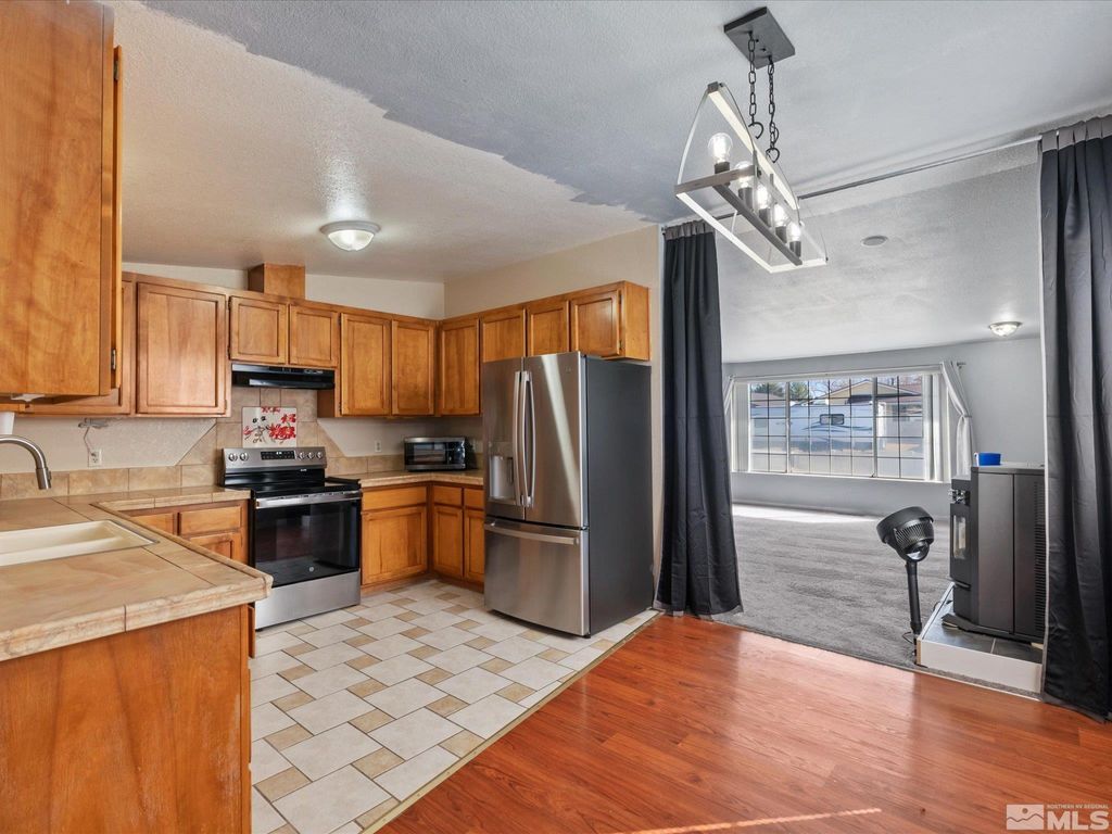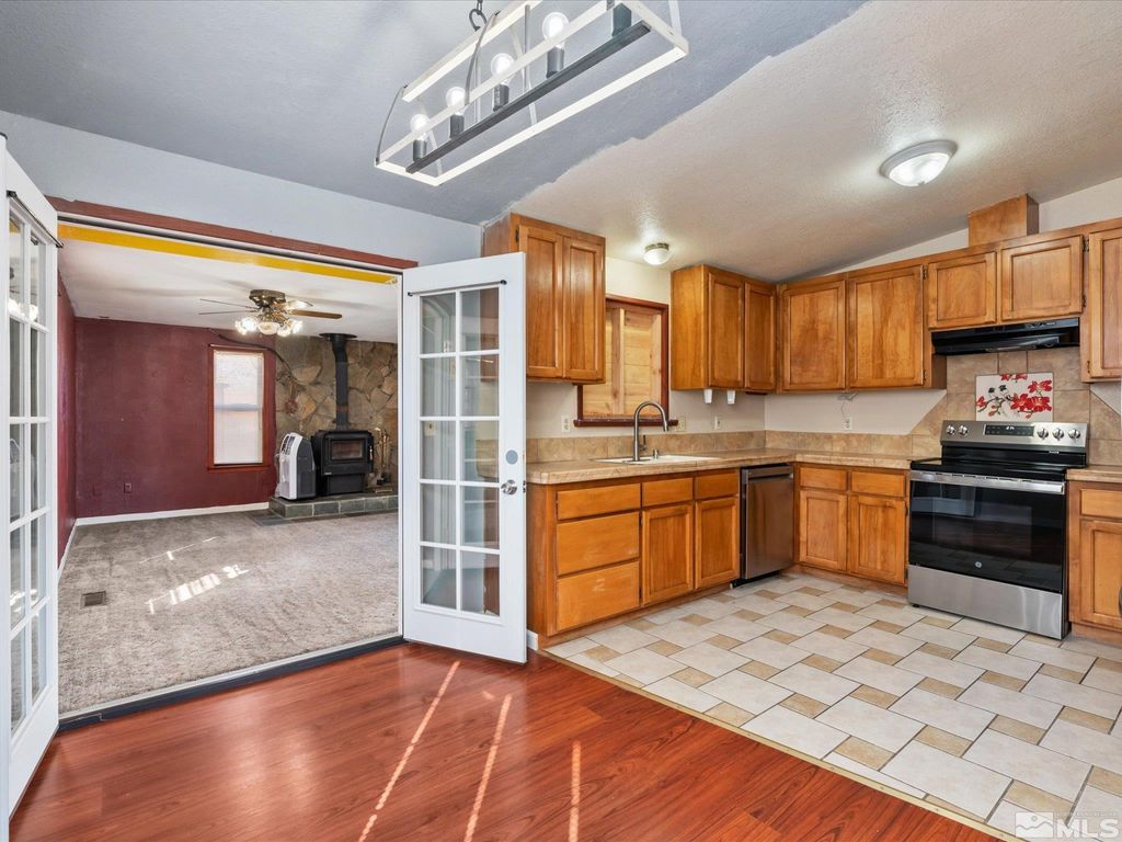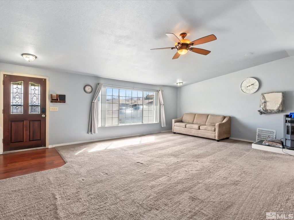 Welcome to this charming single-family home built in 1992. This residence offers three bedrooms and two bathrooms, spanning 1,720 square feet of living space. The home features a spacious living room with high ceilings, a tiled kitchen, and an additional 280-square-foot bonus area, perfect for a family room, office, or den. This extra space includes a wood-burning stove on a slate hearth and a sliding door leading to the backyard. The kitchen offers brand new appliances such as refrigerator, dishwasher, and stove, all purchased within the last 2 years! The primary bedroom boasts backyard access, a walk-in shower, and dual vanity sinks. The backyard includes a storage shed and a partially covered patio, providing ample outdoor space for relaxation and entertaining. Located in a quiet neighborhood, this property combines comfort and convenience, making it an excellent choice for homeowners seeking space for relaxation and entertaining. Located in a quiet neighborhood, this property combines comfort and convenience, making it an excellent choice for homeowners seeking space and functionality in Carson City.