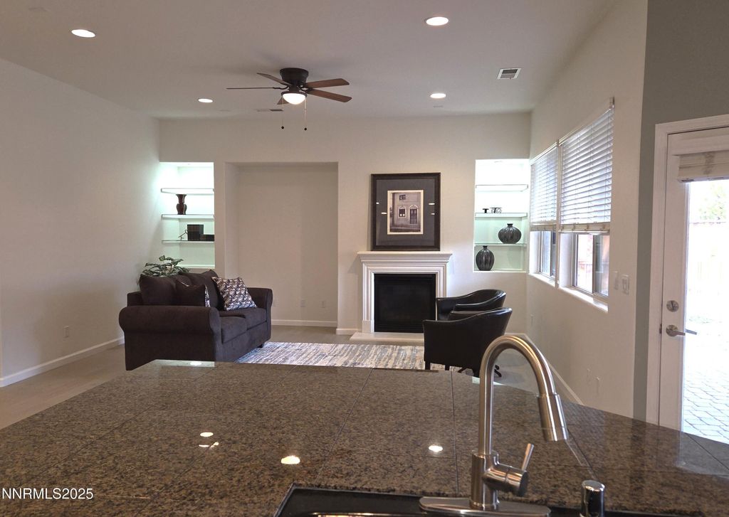 Christmas Specials. New flooring throughout and 3 year old fully paid solar system is included. Located in the peaceful gated community of Sonoma at The Vineyards, this 2,372 square foot, 4 bed room + den, 3 full bath and 3 car garage move in ready. The welcoming front yard and entry invite you into the large foyer and comfortable great room, greeting you with high ceilings and large windows, bathing this wonderful home in light. The view of the gas log fireplace centers your attention from the great room and the kitchen. The kitchen is adorned with beautiful black granite countertops and a large island that invites a crowd. But never fear there are tons of cabinets, a pantry, plus a desk/workspace and a dining area. This spacious great room provides plenty of room for everyone to stay involved. Bedrooms are divided into two areas. The private primary bedroom has a drop zone with extra storage and a huge walk in closet. The room itself is large, with space for a king size bed, dressers and more. The primary bath is an oasis with double sinks, an oversized shower stall and a deep...relaxing garden tub that will whisk you away from the chaos of the day. On the same side of the house there is a large den with double French doors and another bedroom with a full sized closet. All colors are neutral The second full bath is across the hall, and the large laundry room is right next to the oversized 3 car garage. On the other side of the house are 2 more spacious bedrooms with large closets. The third full bath has double sinks and is located between the 2 bedrooms. Perfect for guests, older kids or for Grandma to have their own space. Outside the great room is a covered paver patio perfect for BBQ's or watching the colorful sky each evening. Maintenance is of no concern as both the furnace and water heater have been replaced in the last 3 years,