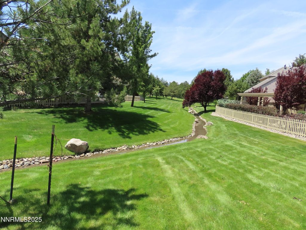 Welcome to the exclusive beautiful parklike area of Caughlin Creek - a gated community within Caughlin Ranch/Juniper Trails. THis area of special community was built in middle of a large greenbelt fall of large trees , ponds, with its seasonal wildlife, endless open walking trails offering a unique lifestyle in our high desert area. Here is the possibility of downsizing from a larger home to a low maintenance one level home without giving up comfort, this 2148 sq.ft, floor plan provides generous formal and informal living space. This home is offered FOR SALE, but sellers will consider selling this home with a " LEASE OPTION TO BUY. with buyer closing within one year. . This is a great opportunity for buyers to purchase a home at previous year's price when the following year's real estate prices could have increased ! Enter this single story low maintenance home through a gated courtyard full of shrubs and and in season, spring flowers . The home backs to common open area. The large backyard tiled patio with pergola offers nice entertaining possibilities, the pation borders a large water feature of a waterfall ( will be winterized soon for the winter ), creating a creek and a pond with waterlilies. All shrubs and flowers, and a peach tree are on drip system. The interior of this home has custom designer charcoal and some tan alternating paint. Enjoy a large master with a beautiful spa like luxury bathroom, The second ensuite bedroom is located on opposite end of this nice floorplan and there is a 3rd office/den room which can provide space for occasionally visiting guests. The sellers offer a 2500 dollars paint credit, if change of paint color of this home is desired. The large formal living room with formal dining area may be able to accomodate and entertain a larger group of guests. The adjoining sophisticated kitchen with granite slab with upscale appliances, cabinetry with pullouts, butler's pantry, opens to a large family room with a gas fireplace. Custom shades and plantation shutters cover the many windows and 2 sliding glass doors. Almost new washer and dryer ( no extra value ) in separate laundry room with shelves and utility sink are included without warranty. There is a 2 car attached garage and separate entry 3rd car attached garage, This 3rd car space can offer an optional space for hobbies, if no 3 car space is needed. In June 2025 a new gas furnace was installed.