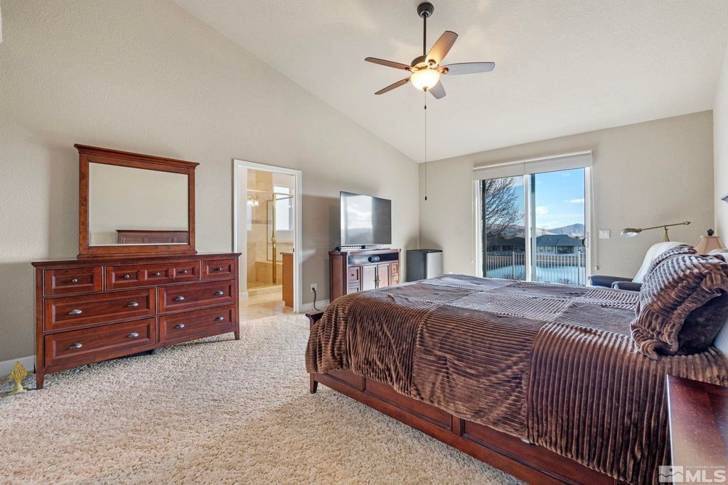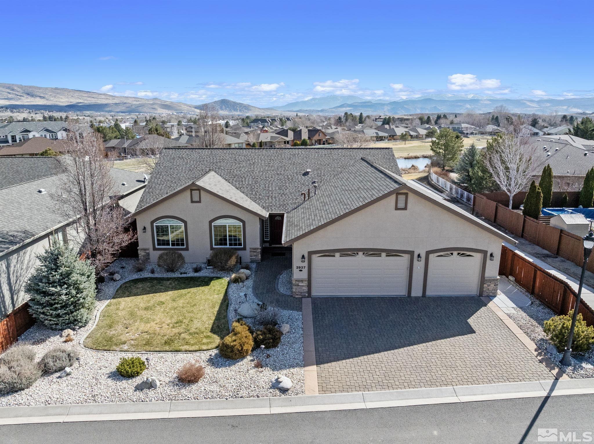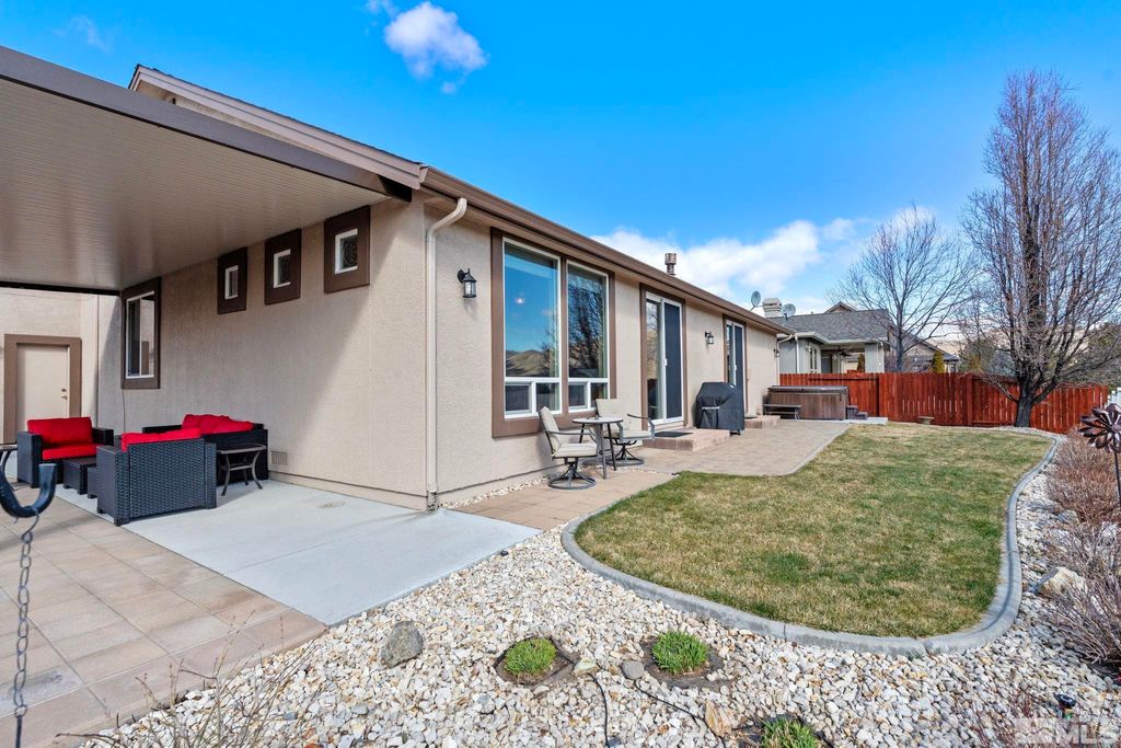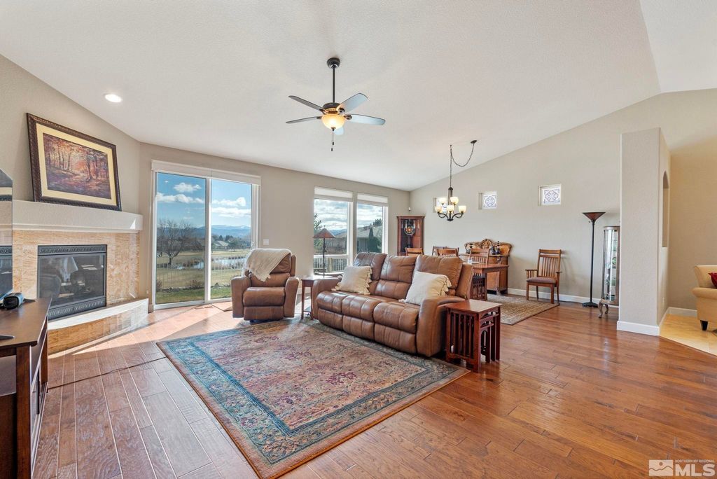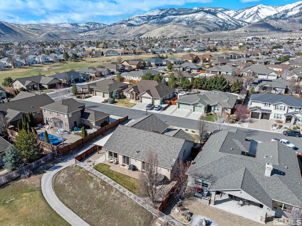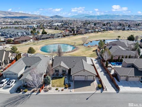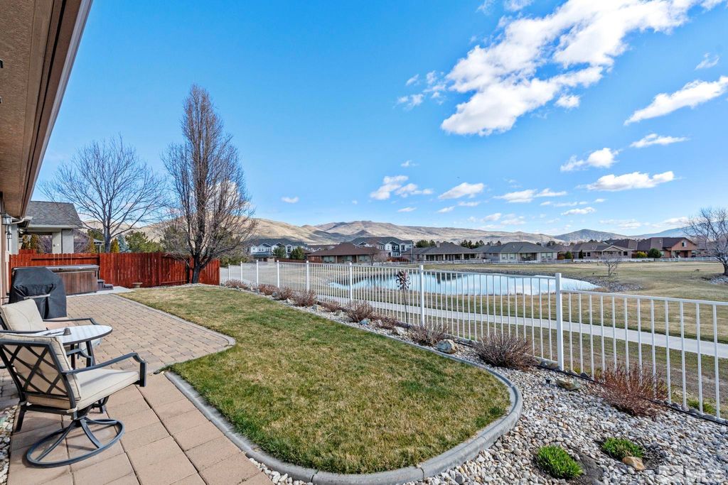 Back on Market at no fault of Sellers. Nestled in NW Carson City this stunning home offers breathtaking views of both the mountains and overlooks the 11th tee of Silver Oak. Step outside to enjoy a private retreat with a hot tub, covered patio with water misters, and plumbed gas bbq (included). This home boasts beautiful wood floors, a cozy gas fireplace, and soaring high/vaulted ceilings that create a spacious atmosphere. A great layout that includes and giant kitchen pantry and 3-car garage makes it easy to call home!, 3 car garage could easily accommodate parking and a work shop. Wall separating 3rd parking spot was put in by previous owners but could function nicely for a workshop if desired or taken out to make more open for parking more toys.