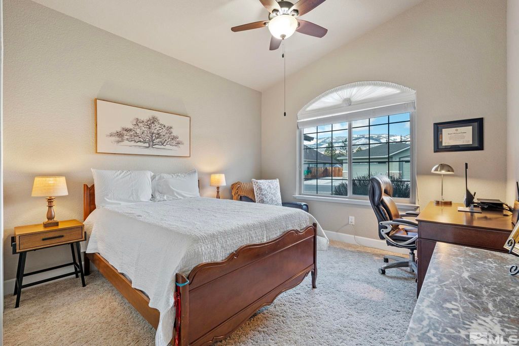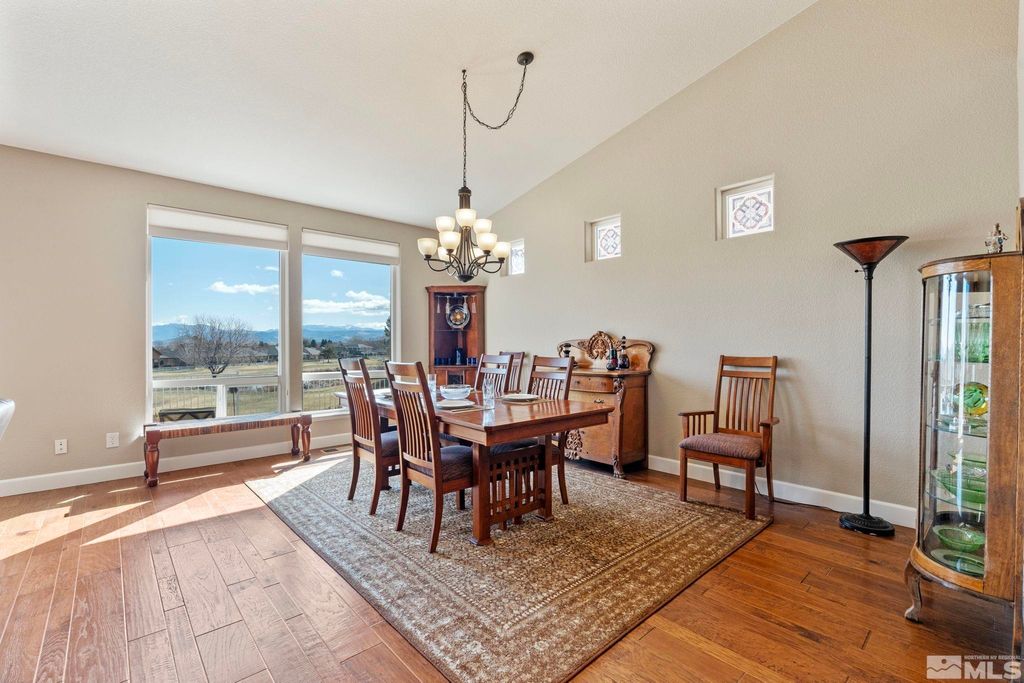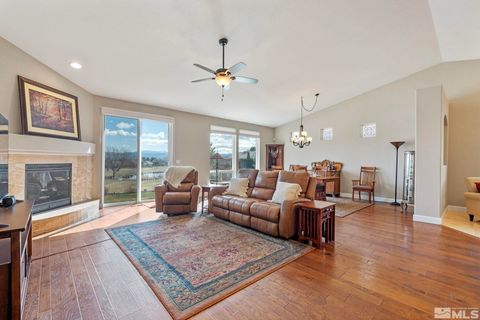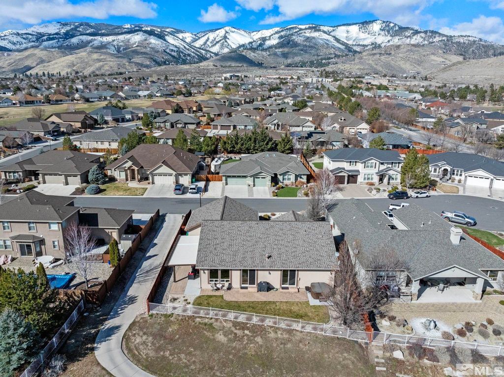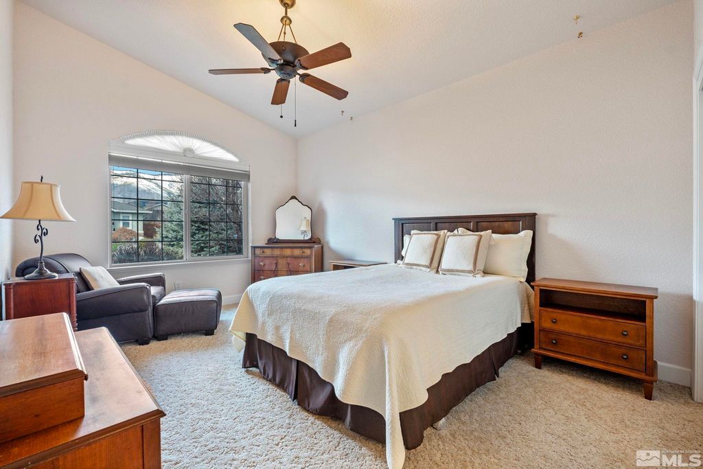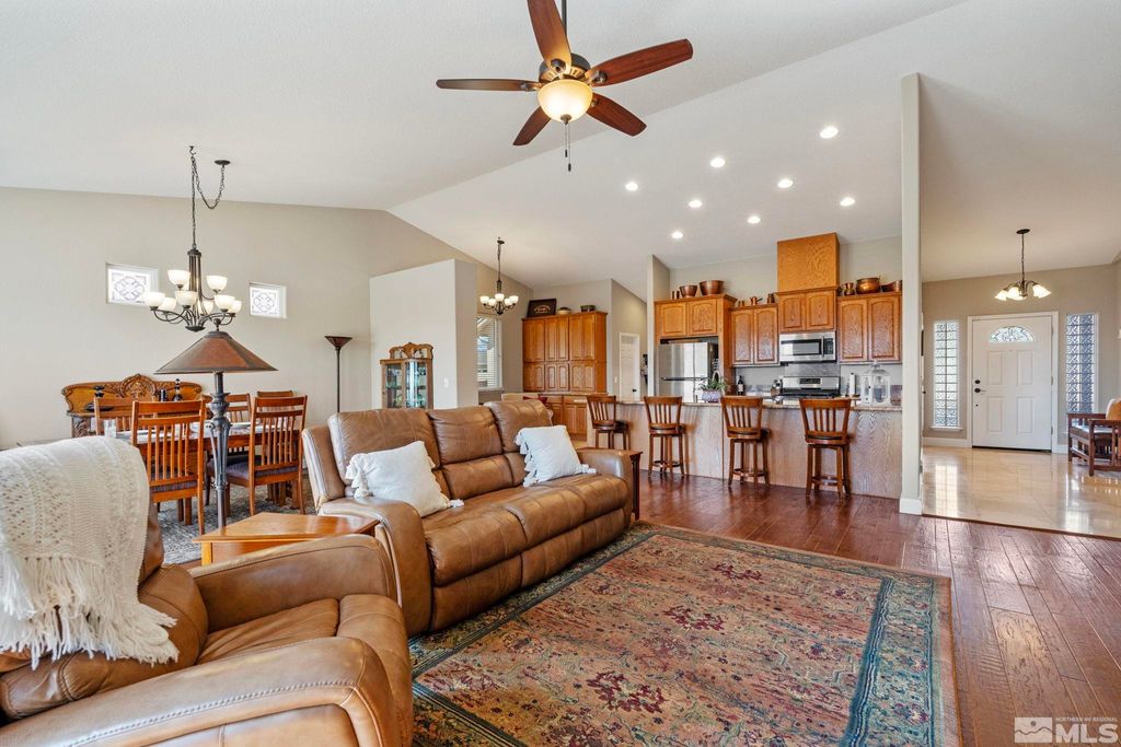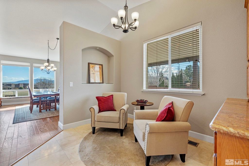 Back on Market at no fault of Sellers. Nestled in NW Carson City this stunning home offers breathtaking views of both the mountains and overlooks the 11th tee of Silver Oak. Step outside to enjoy a private retreat with a hot tub, covered patio with water misters, and plumbed gas bbq (included). This home boasts beautiful wood floors, a cozy gas fireplace, and soaring high/vaulted ceilings that create a spacious atmosphere. A great layout that includes and giant kitchen pantry and 3-car garage makes it easy to call home!, 3 car garage could easily accommodate parking and a work shop. Wall separating 3rd parking spot was put in by previous owners but could function nicely for a workshop if desired or taken out to make more open for parking more toys.