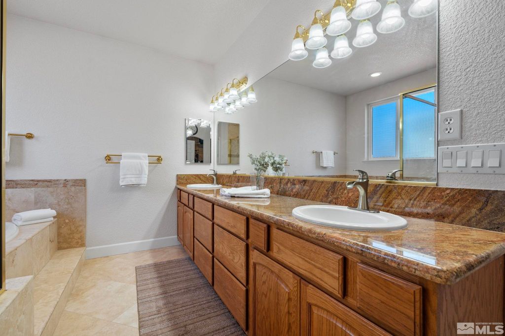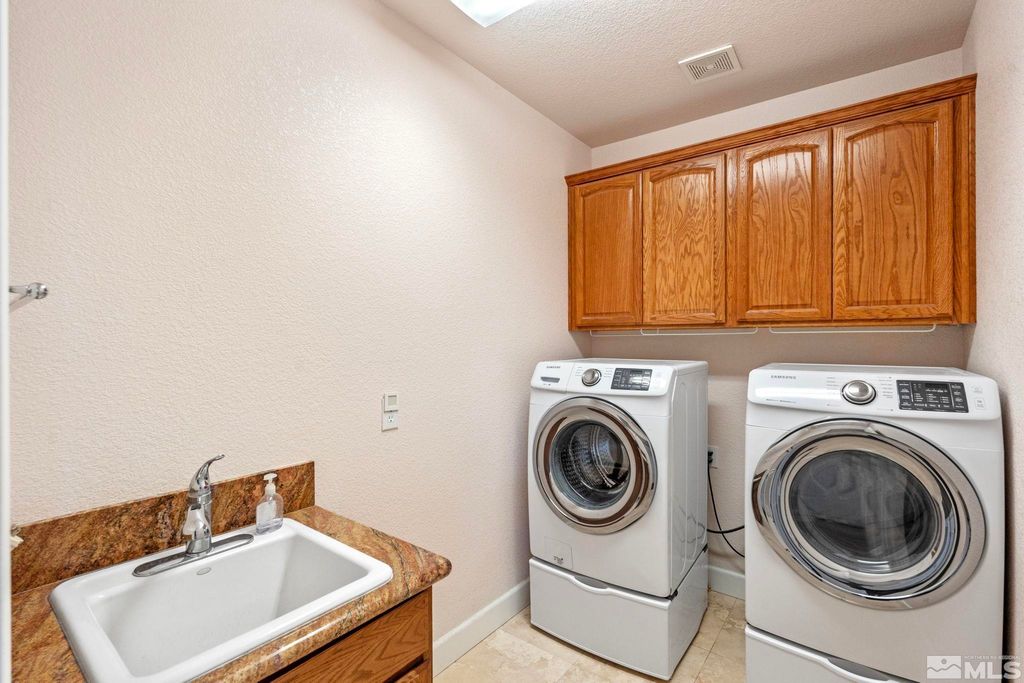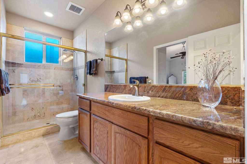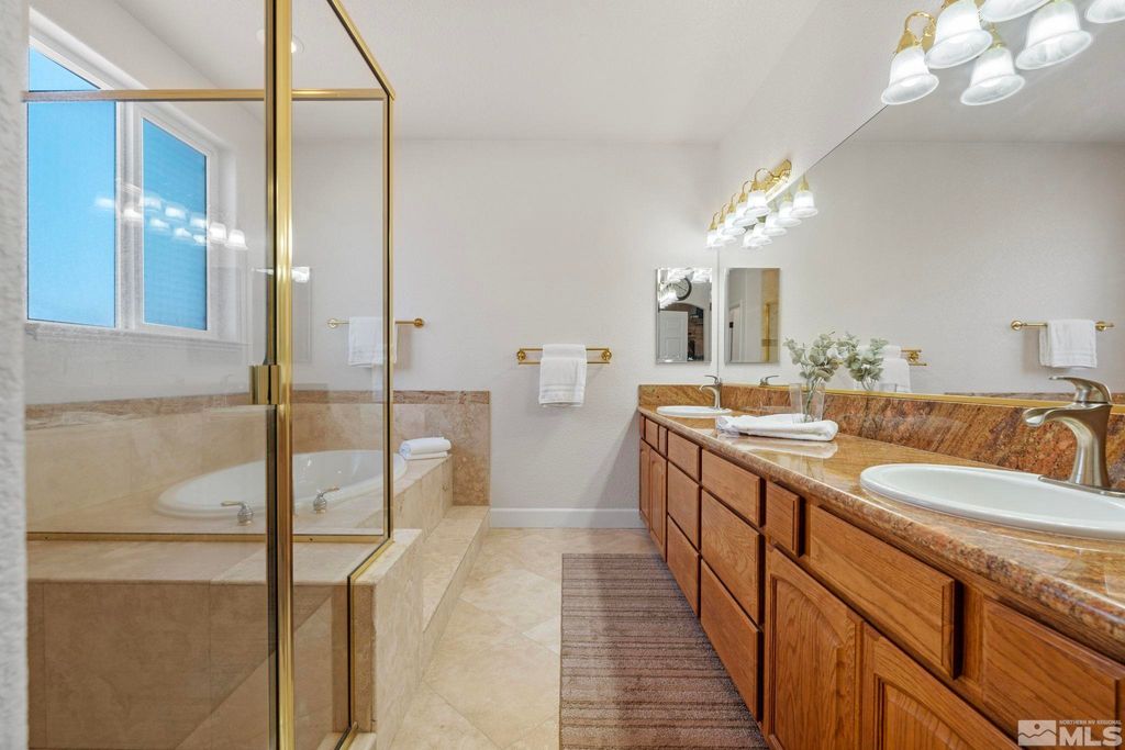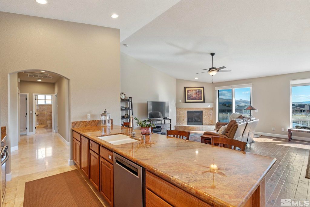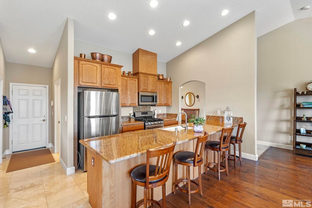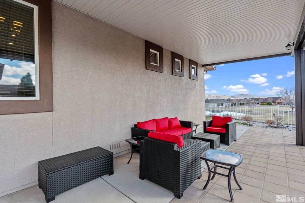 Back on Market at no fault of Sellers. Nestled in NW Carson City this stunning home offers breathtaking views of both the mountains and overlooks the 11th tee of Silver Oak. Step outside to enjoy a private retreat with a hot tub, covered patio with water misters, and plumbed gas bbq (included). This home boasts beautiful wood floors, a cozy gas fireplace, and soaring high/vaulted ceilings that create a spacious atmosphere. A great layout that includes and giant kitchen pantry and 3-car garage makes it easy to call home!, 3 car garage could easily accommodate parking and a work shop. Wall separating 3rd parking spot was put in by previous owners but could function nicely for a workshop if desired or taken out to make more open for parking more toys.