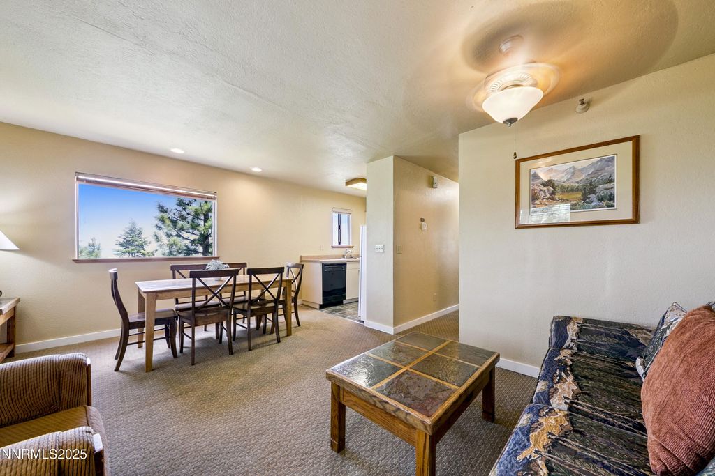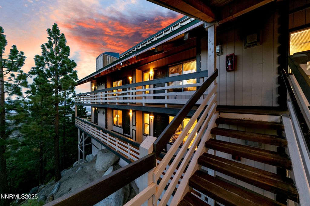 Fantastic value and priced to sell for this fully furnished, two bedroom, one bath unit in a brand new development, called 305 Galaxy Lane, HOA. Located in a very private setting, this eight plex, has panoramic forest views, with even some views of the Carson Valley. The unit has a gas log fireplace in living room with ceiling fan, stackable washer/dryer in bedroom closet. Thermostat in hallway works fireplace. Each bedroom has it's own thermostat with electric baseboard heat. Other features include individually wired Wi-Fi, fire sprinkler system throughout the building, freshly painted exterior and stair case, metal roof, & ski locker for each unit near loading zone. Parking is located in nearby common Tahoe Village parking lot. Tahoe Village HOA covers trash (located in parking lot), cable TV, snow removal for all common areas and streets. Tahoe Village is also the beneficiary of a brand new community pool and clubhouse, currently under construction, and paid for by the 323 Peak Development project. Located within walking distance to Heavenly Valley's Stagecoach Lodge and Ski Lift, as well as a local bar/grill, The Fox and Hound and mini market. Close to miles of hiking and biking trails, including The Tahoe Rim Trail. Perfect for a low priced NV address, short term rental or second home getaway.