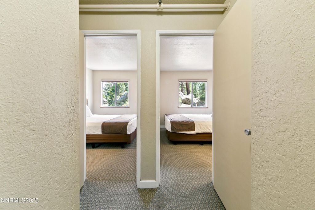 Fantastic value and priced to sell for this fully furnished, two bedroom, one bath unit in a brand new development, called 305 Galaxy Lane, HOA. Located in a very private setting, this eight plex, has panoramic forest views, with even some views of the Carson Valley. The unit has a gas log fireplace in living room with ceiling fan, stackable washer/dryer in bedroom closet. Thermostat in hallway works fireplace. Each bedroom has it's own thermostat with electric baseboard heat. Other features include individually wired Wi-Fi, fire sprinkler system, freshly painted exterior and stair case, metal roof, & ski locker for each unit near loading zone. Parking is located in nearby common Tahoe Village parking lot. Tahoe Village HOA covers trash (located in parking lot), cable TV, snow removal for all common areas and streets. Tahoe Village is also the beneficiary of a brand new community pool and clubhouse, currently under construction, and paid for by the 323 Peak Development project. Located within walking distance to Heavenly Valley's Stagecoach Ski Lift, as well as the local bar/grill, The Fox and Hound and mini market. Close to miles of hiking and biking trails, including the Tahoe Rim Trail. Perfect for a low priced NV address, a short term rental or second home getaway.