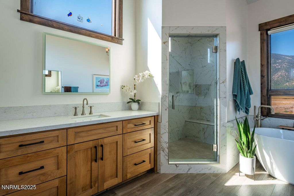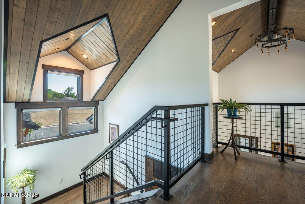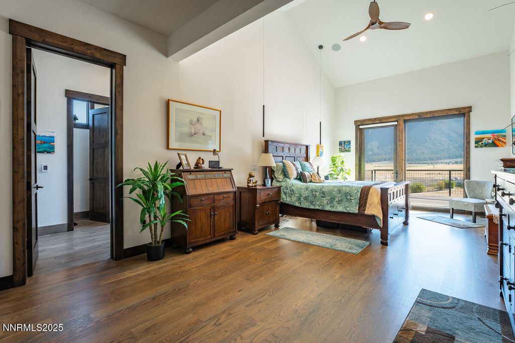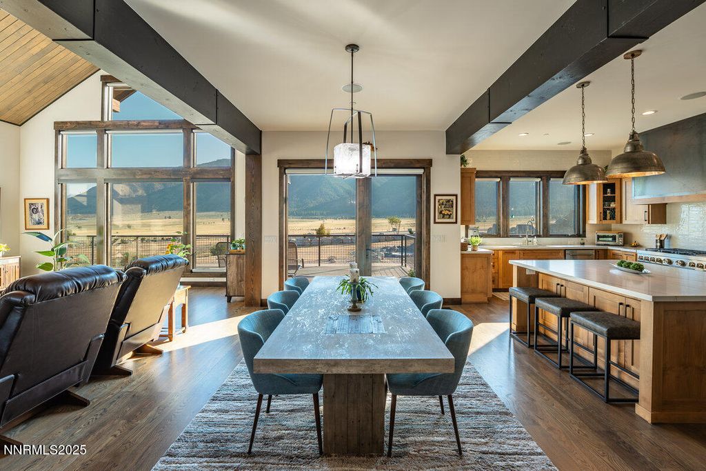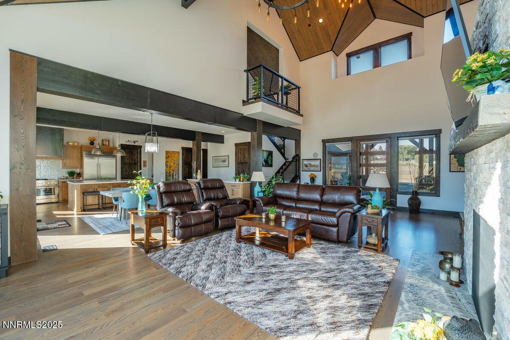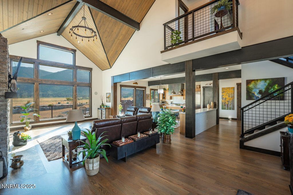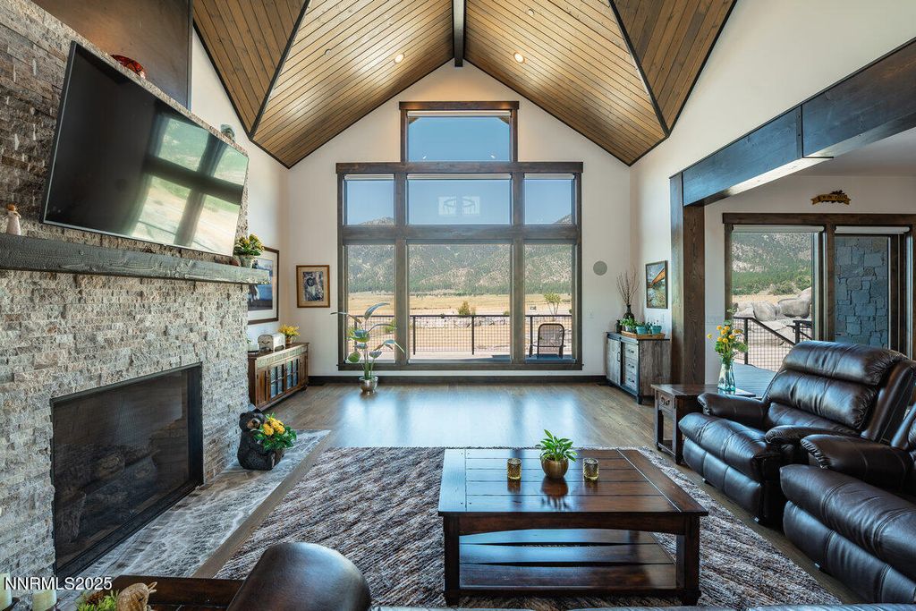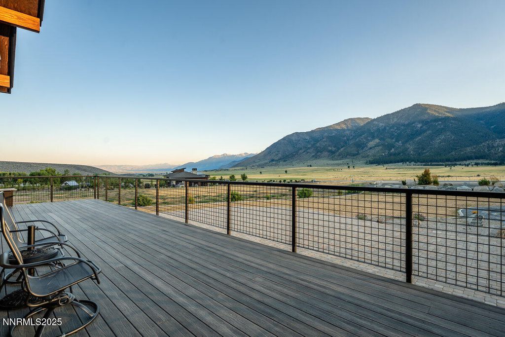 Secured behind the private gates of Coyote Ranch Estates, this newly built custom home sits on 2 acres with breathtaking views of Jacks Valley Ranch and the Sierra Nevada Mountains. This architectural masterpiece boasts a seamless blend of modern elegance and traditional design elements. Upon entry, you are greeted by a grand great room featuring solid hardwood floors, soaring vaulted ceilings, and expansive windows that frame panoramic views. With a newly formed HOA, Seller is offering one year prepayment of HOA dues. A stunning hardwood ceiling and metal trim accentuate the room's grandeur, while a state-of-the-art built-in surround sound system, electric shade system, and easy access to the expansive fortress deck and paver patio enhance the home's entertainment capabilities. The chef's kitchen is a true focal point, outfitted with top-of-the-line commercial-grade KitchenAid dual-fuel range, cooktop, 48" refrigerator, and built-in microwave. The solid Adler wood cabinetry complements the striking quartzite countertops, and the Kohler undermount sink adds both style and function. The main-level master suite offers a serene retreat with mesmerizing views, a luxurious custom bathroom with a large standalone steam-shower system, a freestanding bathtub, heated floors, and power mirrors. Upstairs features an additional ensuite bedroom and family room with half bath, Brazilian Tiger Wood flooring, a full bar with built-in refrigerator, and another stunning hardwood ceiling complete the upper level. This home also features an oversized three-car garage with electric vehicle charging capabilities, as well as beautifully landscaped grounds with ornamental trees, shrubs, and grasses. Granite rock boulder walls and an elegant water feature further enhance the property's appeal. Coyote Ranch Estates is a boutique community of just 16, two acre homesites, offering privacy, security, and convenience - minutes from the historic town of Genoa, Genoa Lakes and Ranch golf courses, Minden-Tahoe Private Airport, the areas super stores and a short drive to Lake Tahoe This is more than a home - it's a lifestyle.