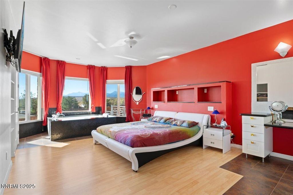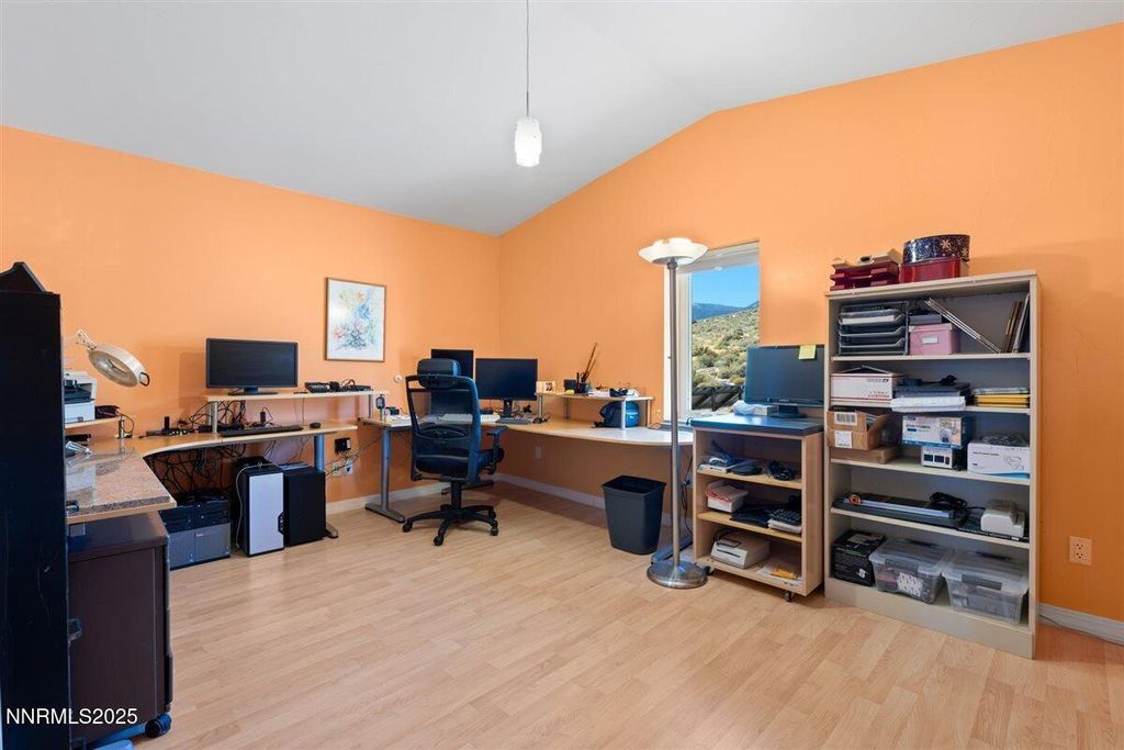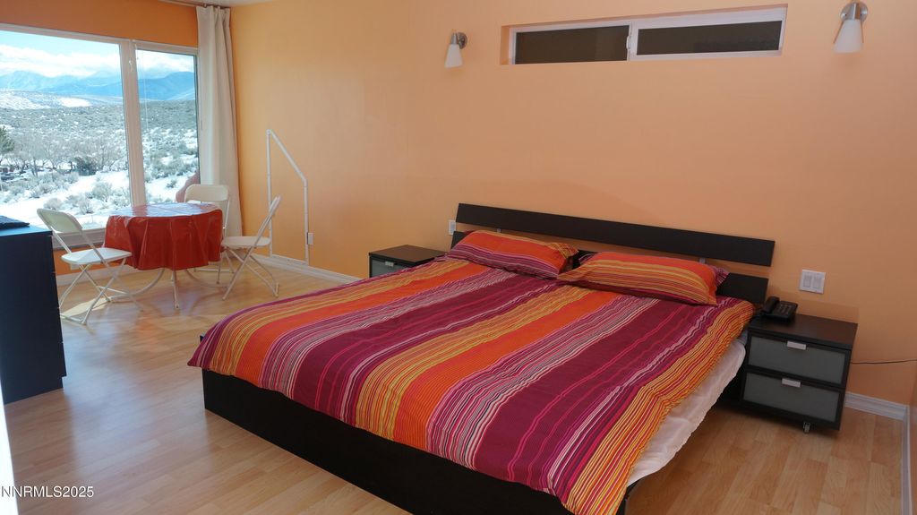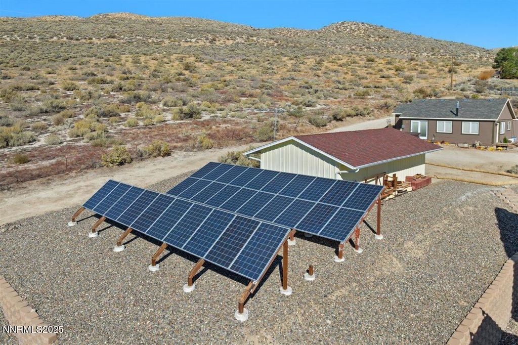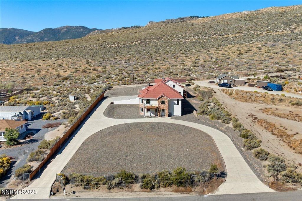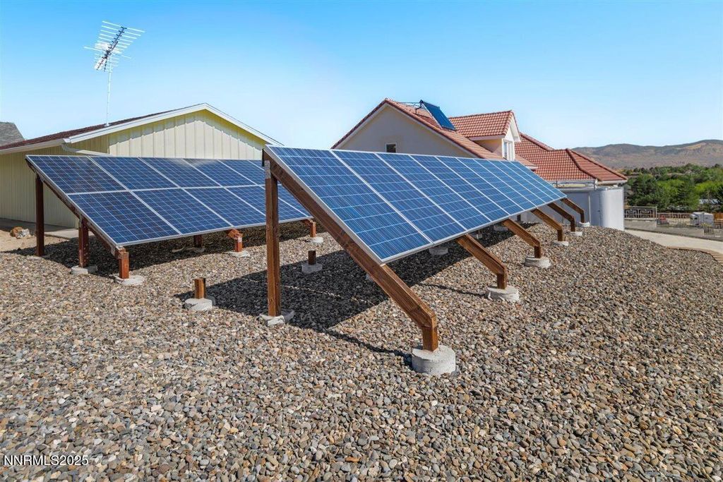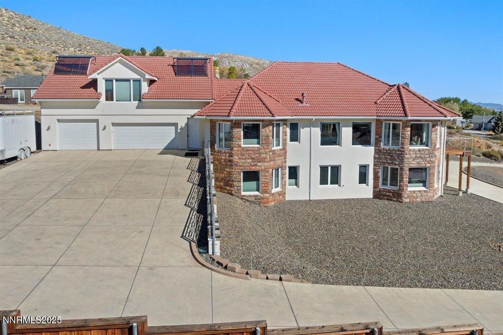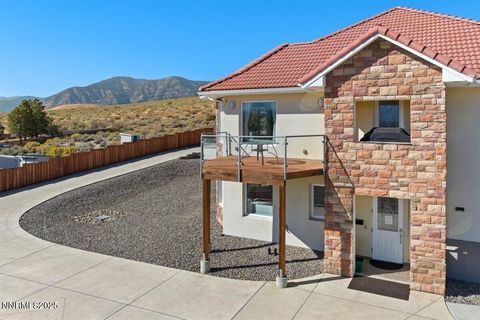 Spectacular scenic mountain views from this unique one-of-a-kind modern European-designed custom home situated on a 1-acre lot in Douglas County with a Carson City address. The Seller is offering a credit to Buyer at the close of escrow. The concrete-paved horse-shoe driveway and garage entry provide plenty of parking for RVs, cars and recreational toys. The home has no rear neighbors, and the lot adjoins BLM land to the west. The neighborhood does not have a Homeowners Association. Designed as a "Nex-Gen" home, with 6 bedrooms, and 4.5 bathrooms on three levels, this home has storage galore with separate rooms, closet organizers, closets and built in cabinets. The main level of the home is finished with a great room, kitchen, walk-in pantry, dining room, laundry room (mud room with sink), and master bedroom all accessible from the 3-car side loading garage at the same level accessed from the southside driveway. The garage has a large shop or storage area in the backroom. The detached storage shed has enough room to park two additional 2 cars. The unique building materials of the home, Integrated Concrete Forms (ICF) with steel reinforcement provide wind and fire resistance, superior insulation and noise reduction. Solar power provides electricity to the home with a gas boiler providing hydronic radiant floor heat throughout the home. Gas fireplaces are in the great room and primary bedroom. Two evaporative coolers provide cooling to the home in the summer months. The home has a private well, connected to self-cleaning carbon filtration system. An oversized septic system and leach field are located downgradient from both the home and well. A 240v/50A power connection on the exterior side of the garage allows for hookup of a backup generator for critical house loads if the new owner wishes to add a generator. The home has another 220-amp outlet on the exterior side of the garage which could be converted for an electric car charger. The construction materials provide both wind and fire resistance. The structure is built with Integrate Concrete Forms (ICF) with steel reinforcement, hydronic radiant heat flooring, solar electricity and water heating with a gas fired boiler back up. Interior finishes include laminate flooring and ceramic tiles on the floors, granite counter tops in the baths and kitchen, and tiled showers and backsplashes. The energy efficiency of this home with onsite utilities (water, solar and septic) equates to very low monthly utility bills for this three level home. The first floor includes 3 bedrooms and 2 baths, a family room, storage room and a kitchenette with a pantry. The second floor includes, a kitchen, a primary bedroom and bath, with a large walk in closet, a half bath, a great room and dining room, and the laundry/mudroom with access from the garage. The third floor includes two bedrooms with walk in closets and a bathroom. The 3-car garage and storage shop includes 1,175 square feet. This unique thoughtfully designed custom built home is in move in condition. Enjoy the low maintenance lot, and energy efficiency that the home construction and utilities provide!