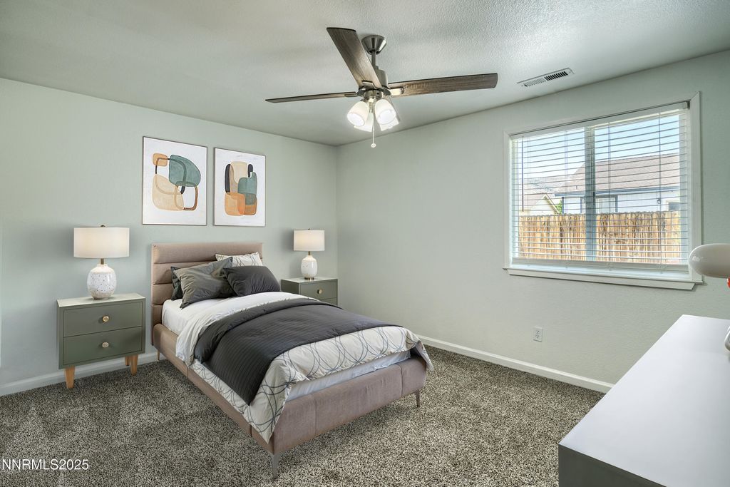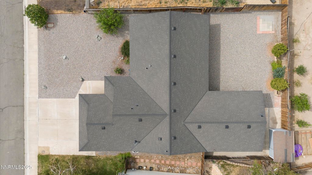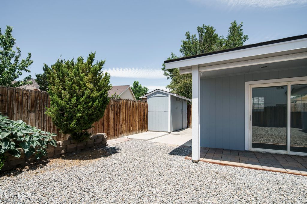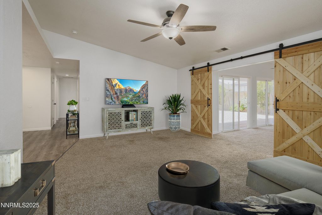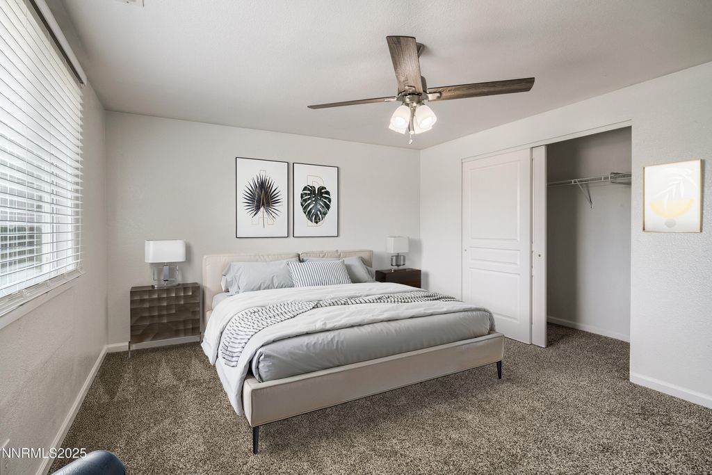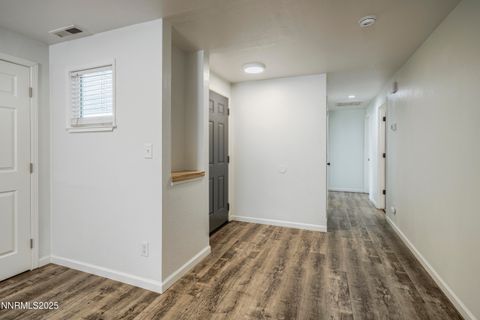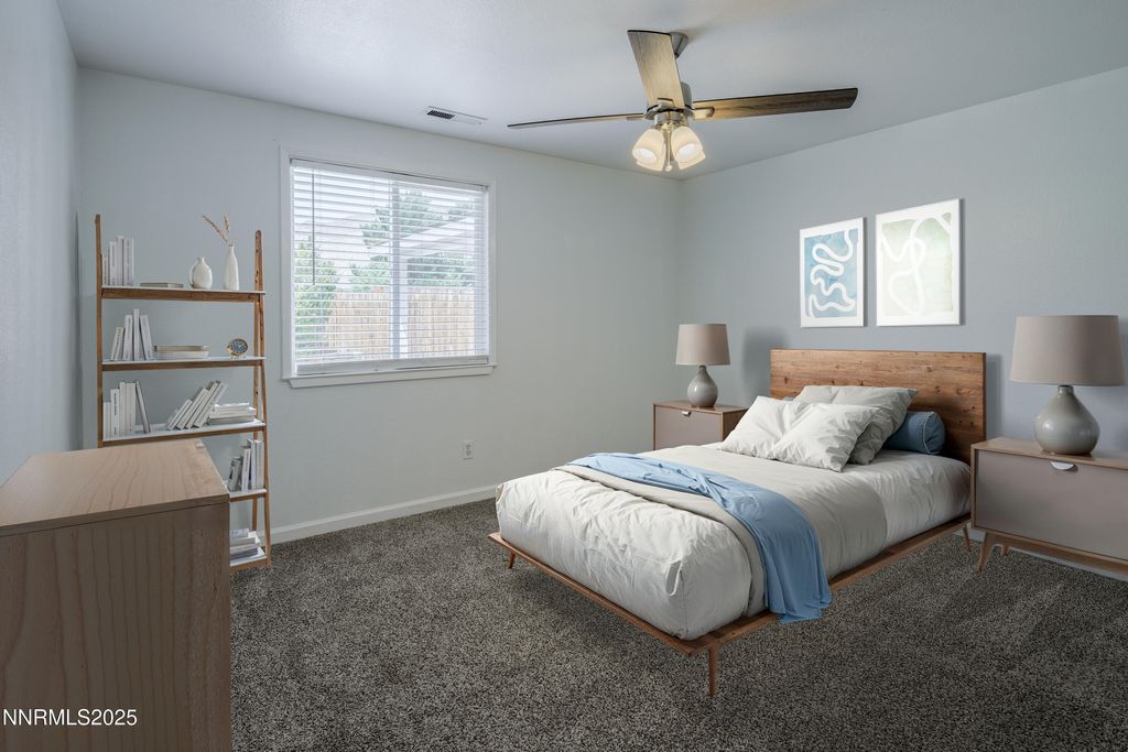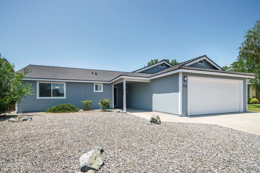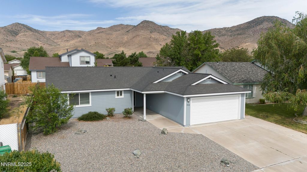 Welcome to this stylishly updated 3-bedroom, 2.5 bath home offering 1,656 sq feet of comfortable living space and a finished 2-car garage. Built in 1997 and thoughtfully updated over the past four years, this move-in ready gem combines function and modern finishes throughout. Notable updates include a new roof (2022), energy-efficient double-pane vinyl windows (excluding the family room), a new water heater, and a fully remodeled kitchen. The kitchen features butcher-block countertops, all-new cabinetry, stainless steel appliances, an upgraded sink, modern hardware, and contemporary lighting. Central A/C was added in 2023 to keep you cool all summer long. Both bathrooms have been fully renovated. The second bathroom features a tub/shower combo, while the primary suite offers a spacious walk-in shower. The entire home features durable luxury vinyl plank flooring with carpet in the bedrooms. Locally handcrafted barn doors separate the family room, offering a flexible space ideal for a home office, den, playroom, or optional fourth bedroom. Modern ceiling fans and updated lighting fixtures have been installed throughout. Enjoy outdoor living on the covered patio, perfect for summer BBQs. A large backyard shed provides ample storage, and the front yard has been zeroscaped for low-maintenance curb appeal. The washer, dryer, and refrigerator - all replaced in 2021 - are included. With easy access to Hwy 50, this home is about 28 miles from the Reno Tahoe Industrial Center and about 15 miles from downtown Carson City. Don't miss your opportunity - schedule a private showing today! The photos with furniture are virtually staged.