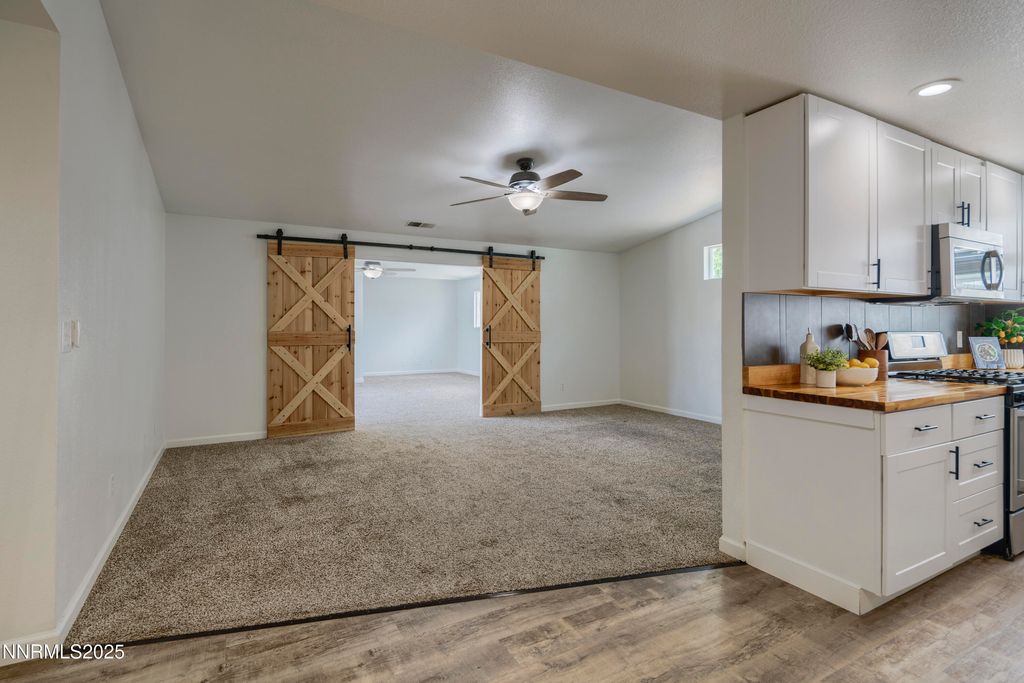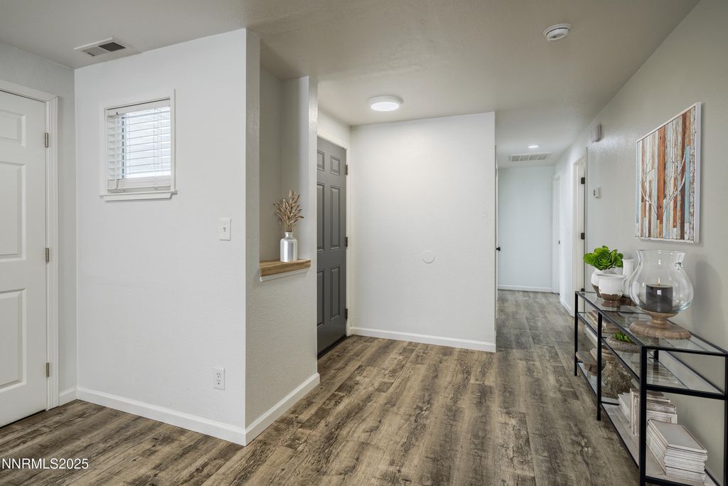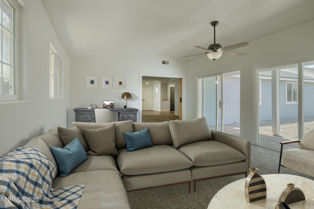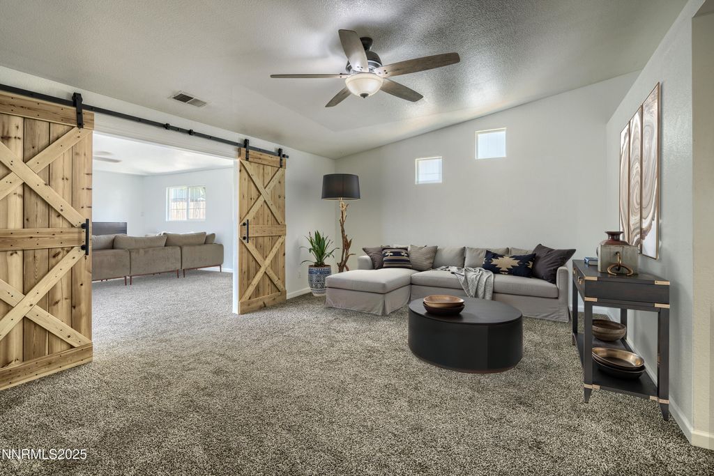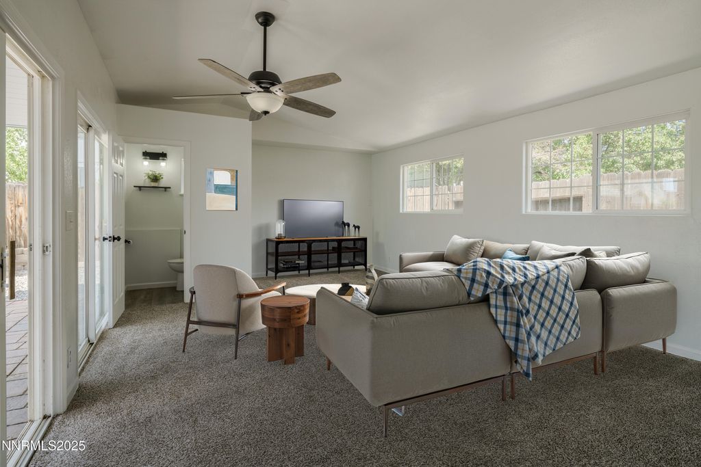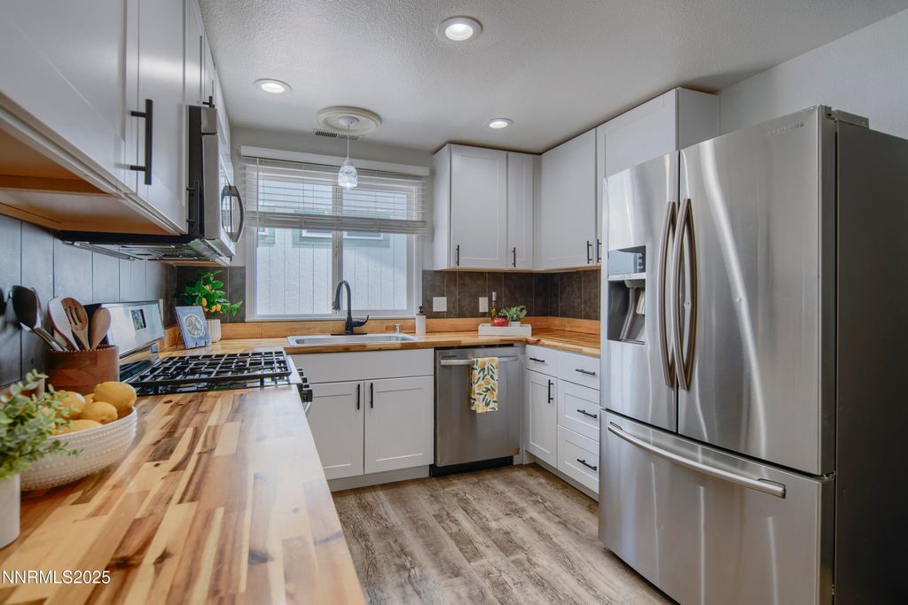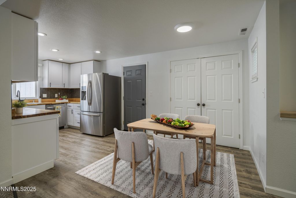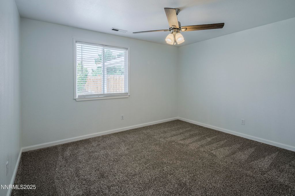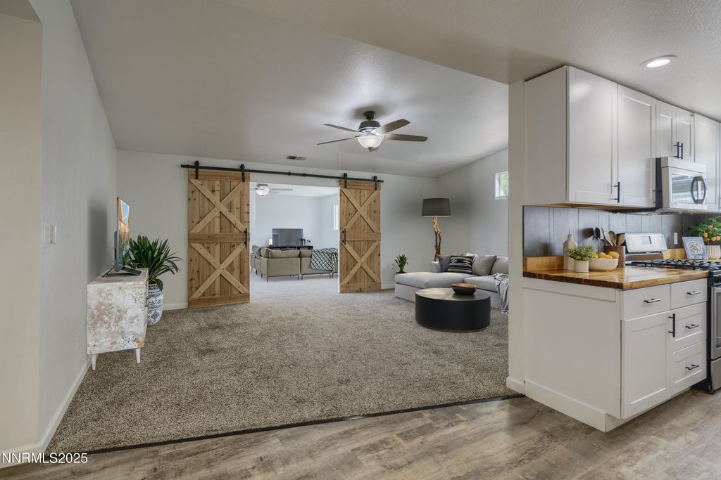 Welcome to this stylishly updated 3-bedroom, 2.5 bath home offering 1,656 sq feet of comfortable living space and a finished 2-car garage. Built in 1997 and thoughtfully updated over the past four years, this move-in ready gem combines function and modern finishes throughout. Notable updates include a new roof (2022), energy-efficient double-pane vinyl windows (excluding the family room), a new water heater, and a fully remodeled kitchen. The kitchen features butcher-block countertops, all-new cabinetry, stainless steel appliances, an upgraded sink, modern hardware, and contemporary lighting. Central A/C was added in 2023 to keep you cool all summer long. Both bathrooms have been fully renovated. The second bathroom features a tub/shower combo, while the primary suite offers a spacious walk-in shower. The entire home features durable luxury vinyl plank flooring with carpet in the bedrooms. Locally handcrafted barn doors separate the family room, offering a flexible space ideal for a home office, den, playroom, or optional fourth bedroom. Modern ceiling fans and updated lighting fixtures have been installed throughout. Enjoy outdoor living on the covered patio, perfect for summer BBQs. A large backyard shed provides ample storage, and the front yard has been zeroscaped for low-maintenance curb appeal. The washer, dryer, and refrigerator - all replaced in 2021 - are included. With easy access to Hwy 50, this home is about 28 miles from the Reno Tahoe Industrial Center and about 15 miles from downtown Carson City. Don't miss your opportunity - schedule a private showing today! The photos with furniture are virtually staged.
