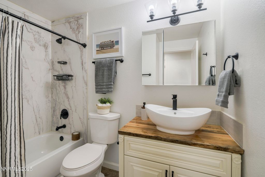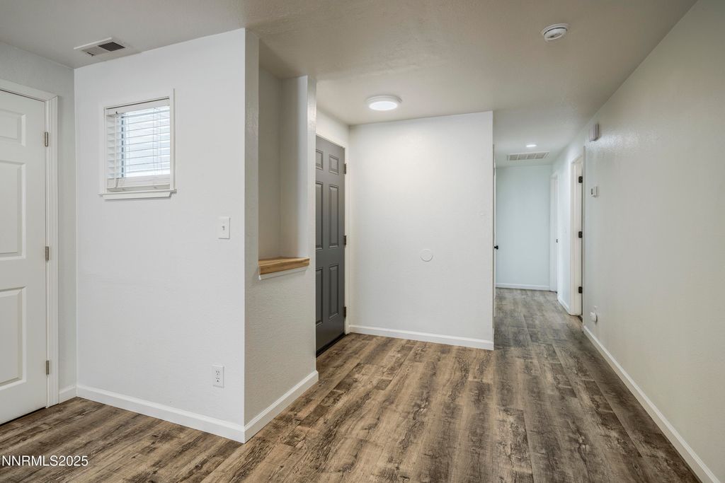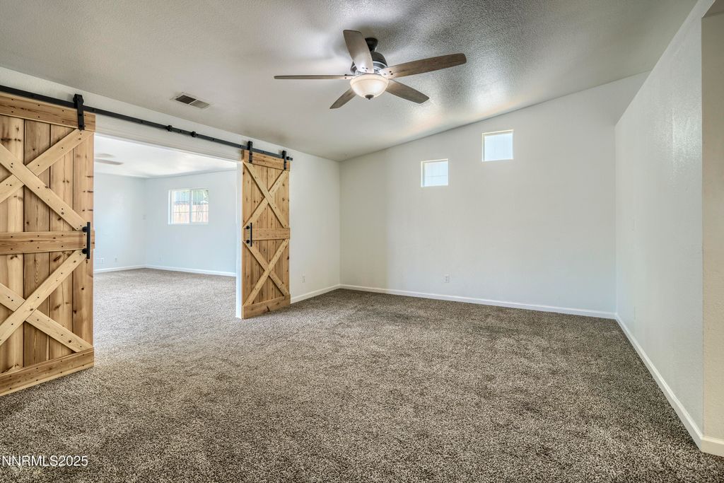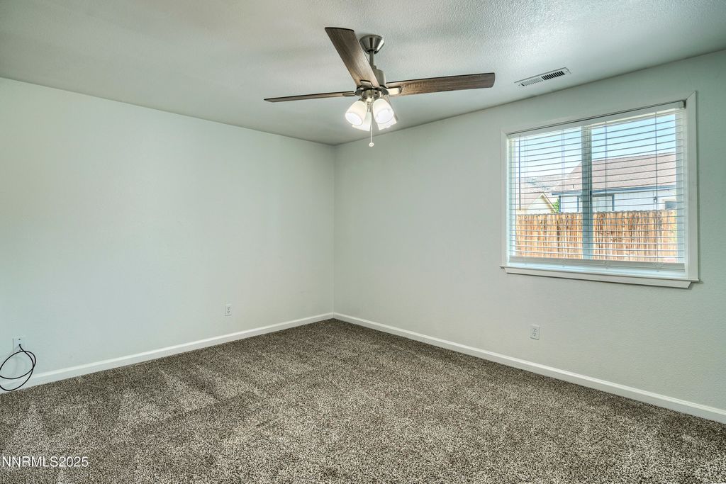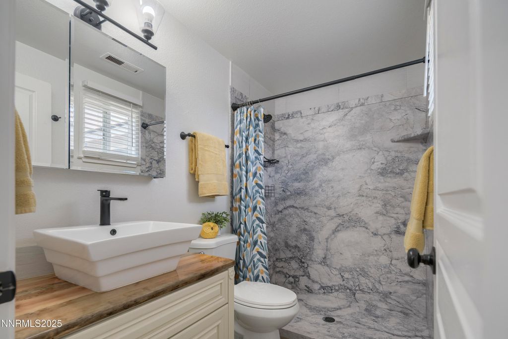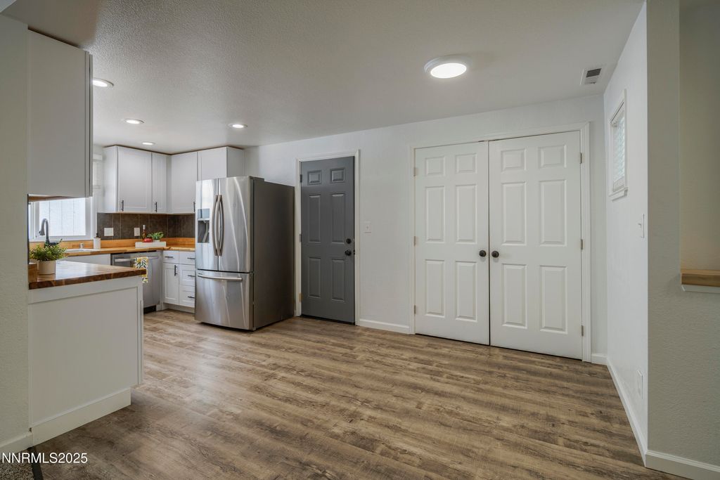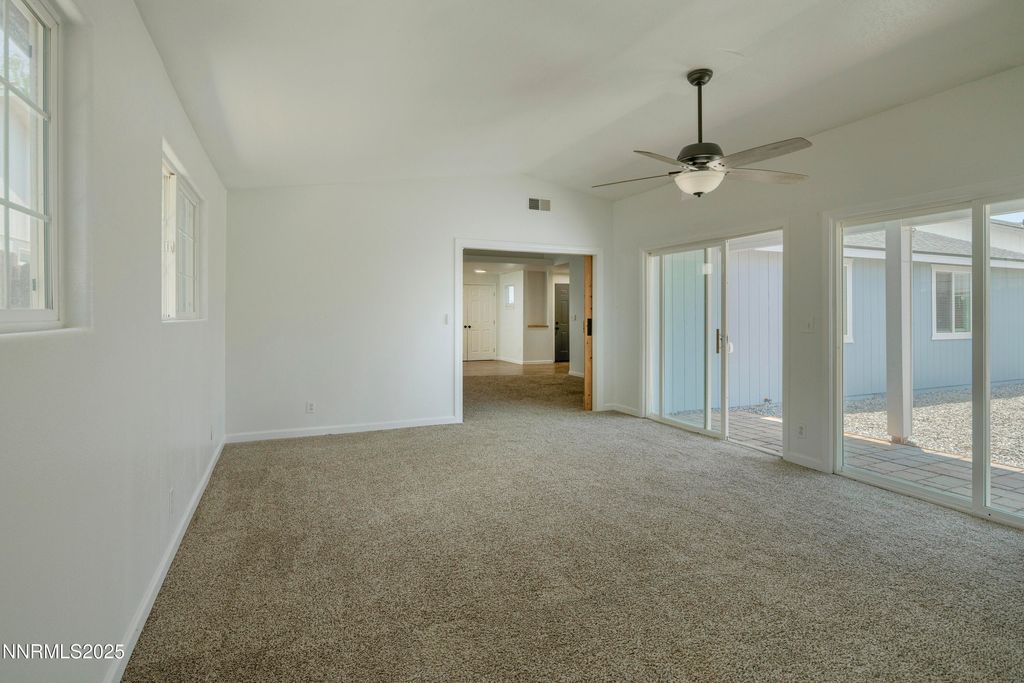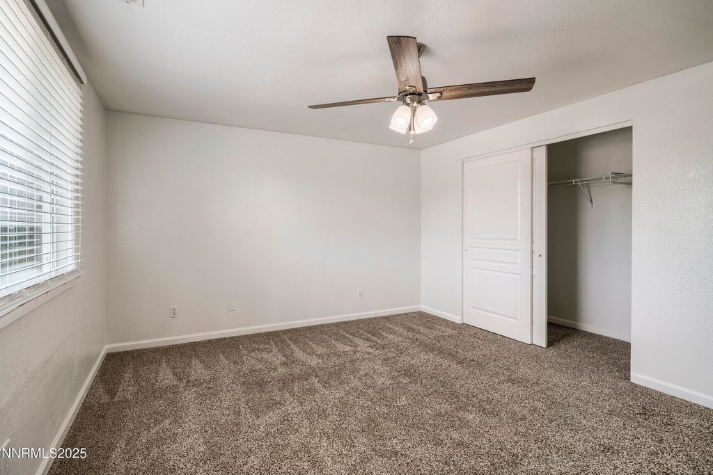Welcome to this stylishly updated 3-bedroom, 2.5 bath home offering 1,656 sq feet of comfortable living space and a finished 2-car garage. Built in 1997 and thoughtfully updated over the past four years, this move-in ready gem combines function and modern finishes throughout. Notable updates include a new roof (2022), energy-efficient double-pane vinyl windows (excluding the family room), a new water heater, and a fully remodeled kitchen. The kitchen features butcher-block countertops, all-new cabinetry, stainless steel appliances, an upgraded sink, modern hardware, and contemporary lighting. Central A/C was added in 2023 to keep you cool all summer long. Both bathrooms have been fully renovated. The second bathroom features a tub/shower combo, while the primary suite offers a spacious walk-in shower. The entire home features durable luxury vinyl plank flooring with carpet in the bedrooms. Locally handcrafted barn doors separate the family room, offering a flexible space ideal for a home office, den, playroom, or optional fourth bedroom. Modern ceiling fans and updated lighting fixtures have been installed throughout. Enjoy outdoor living on the covered patio, perfect for summer BBQs. A large backyard shed provides ample storage, and the front yard has been zeroscaped for low-maintenance curb appeal. The washer, dryer, and refrigerator - all replaced in 2021 - are included. With easy access to Hwy 50, this home is about 28 miles from the Reno Tahoe Industrial Center and about 15 miles from downtown Carson City. Don't miss your opportunity - schedule a private showing today! The photos with furniture are virtually staged.