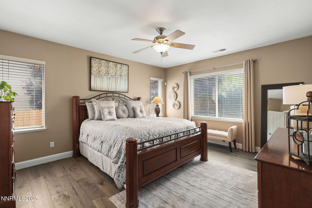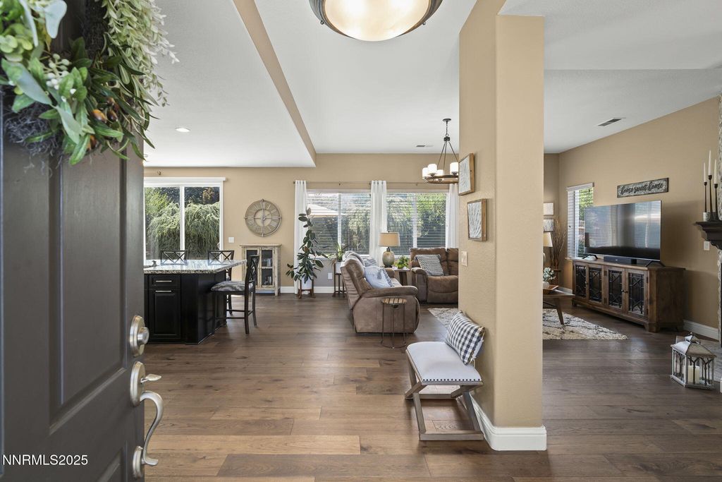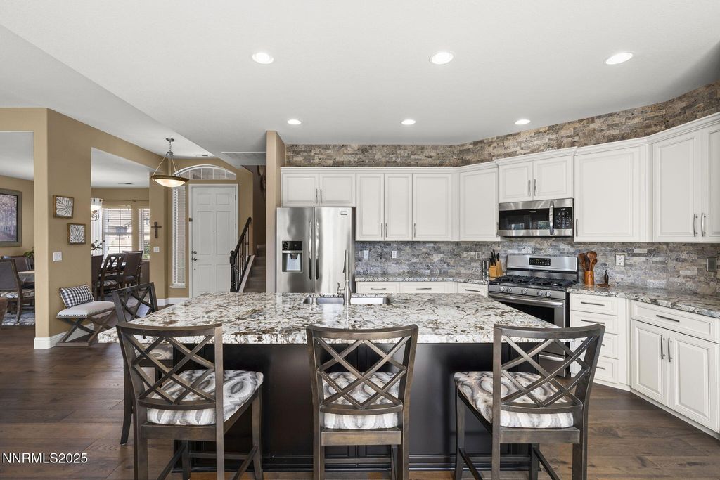 This exquisitely updated home showcases exceptional attention to detail, both inside and out. Featuring contemporary finishes and rich engineered hardwood flooring, the interior radiates warmth and sophistication. The gourmet kitchen is a showstopper, complete with seamless granite countertops, an expansive island, soft-close cabinetry, pull-out drawers in lower cabinets, custom coffee bar with wine refrigerator, newer fingerprint-resistant stainless steel appliances, and pantry. The wall between the living and dining rooms was opened up to create a seamless flow, perfect for entertaining. The gas fireplace makes a statement with floor to ceiling rock that accentuates the 10-foot ceilings in the room. Make your way to the primary suite, located on the first floor, to experience the luxurious air-jet tub, oversized shower, dual vanities, and large, walk-in closet. Upstairs is just as impressive, with three more bedrooms, a large loft with built-in workstation and cabinetry, and a sizable bonus room, perfect for a home theater, playroom, gym, or easily add a door to create a fifth bedroom! Other features include newer interior and exterior paint, a 3-car finished garage with cabinets and a workbench, steel tub in the upstairs bathroom, tall countertops in bathrooms, storage shed on concrete pad, seamless gutters, central vacuum, and upgraded baseboards in the lower level. The property has no direct rear neighbors, with open space running behind the lot. Enjoy the convenience of being minutes from shopping and dining - Trader Joe's, Costco, and more - along with nearby parks, trails, and scenic paved paths that wind through the community. And...no HOA!